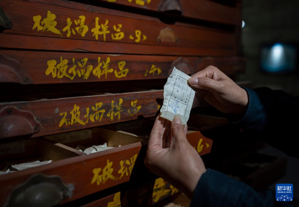 5月16日,工作人員在展示玻璃樣品柜內(nèi)的一個玻璃樣品。